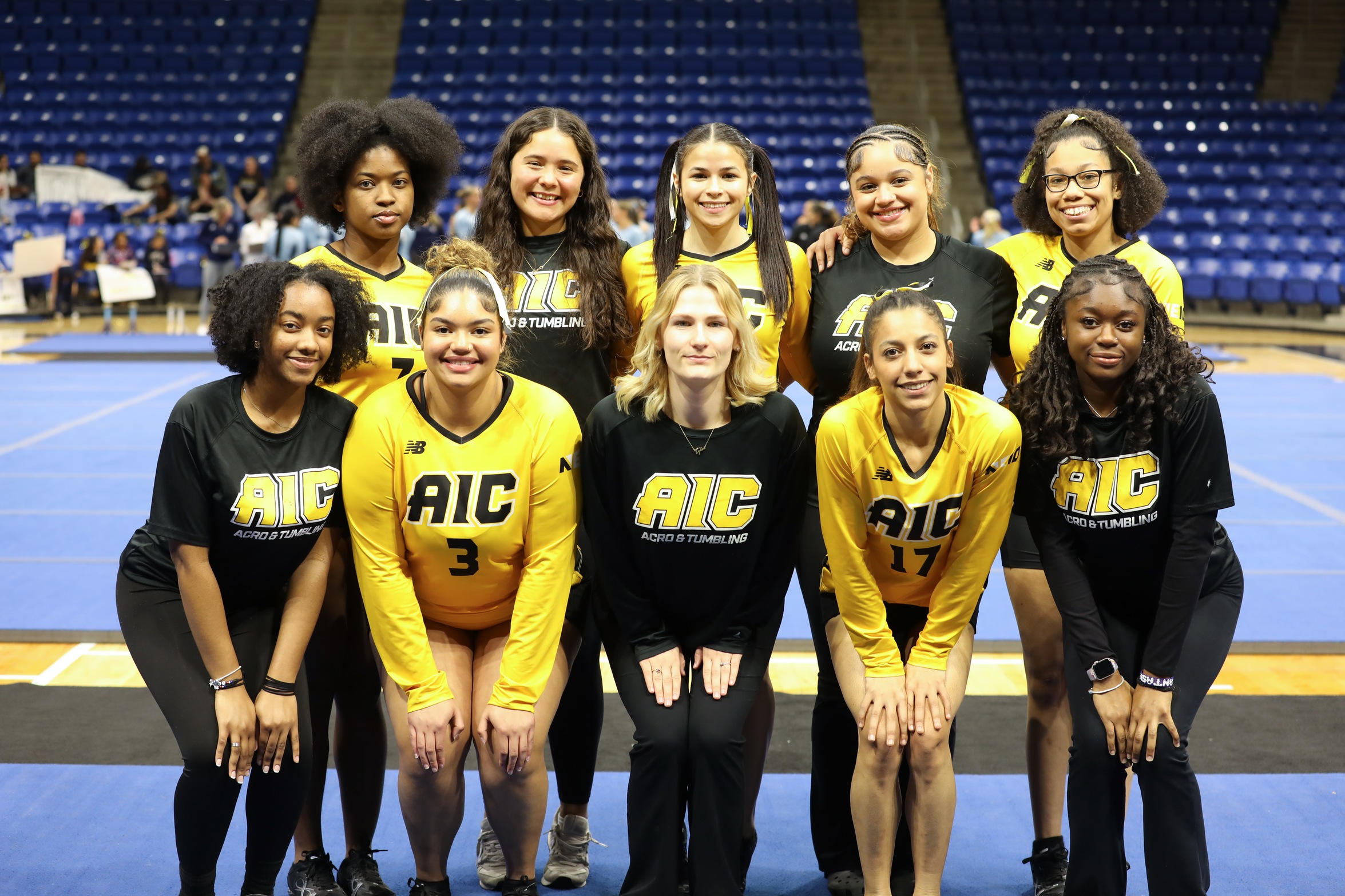 SPRINGFIELD, Massachusetts - "Progress is progress" has been the mantra of American International College President Nicolle Cestero, and that motto was in action for the acrobatics & tumbling team in its season opener against Georgian Court University on Thursday, February 12. Despite a setback, the team blew past its program record in the 205.545-57.300 loss.